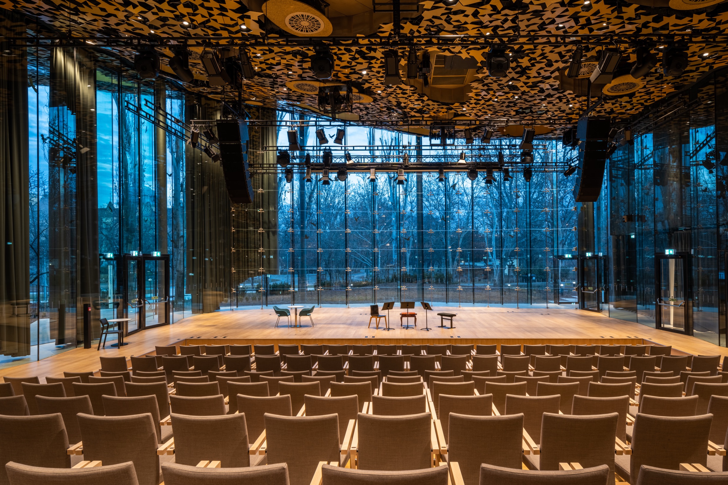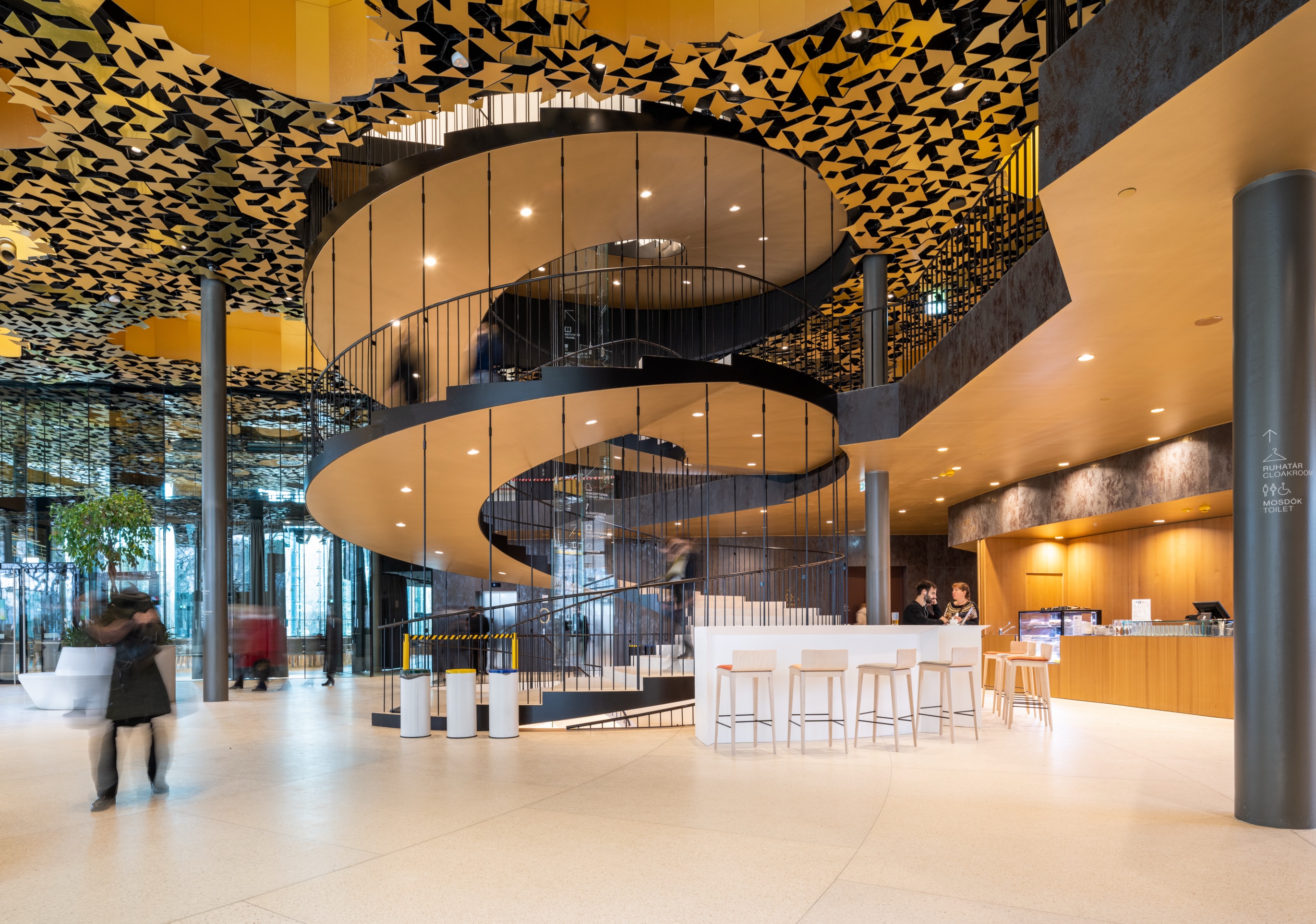 „Az 5 szintes épület 3 szimbolikus téregységre tagozódik, amelyeket a lebegő „olasz” lépcső köt össze, a térszint alatt pedig tömör, fehér spirálba változik át. A felső szint a szellemi munkáé, a héjazatba rejtett oktatóhelyiségek a világ első zenei intézményének adtak teret.” írta Török Szabolcs Bence az épület leíró szövegében.