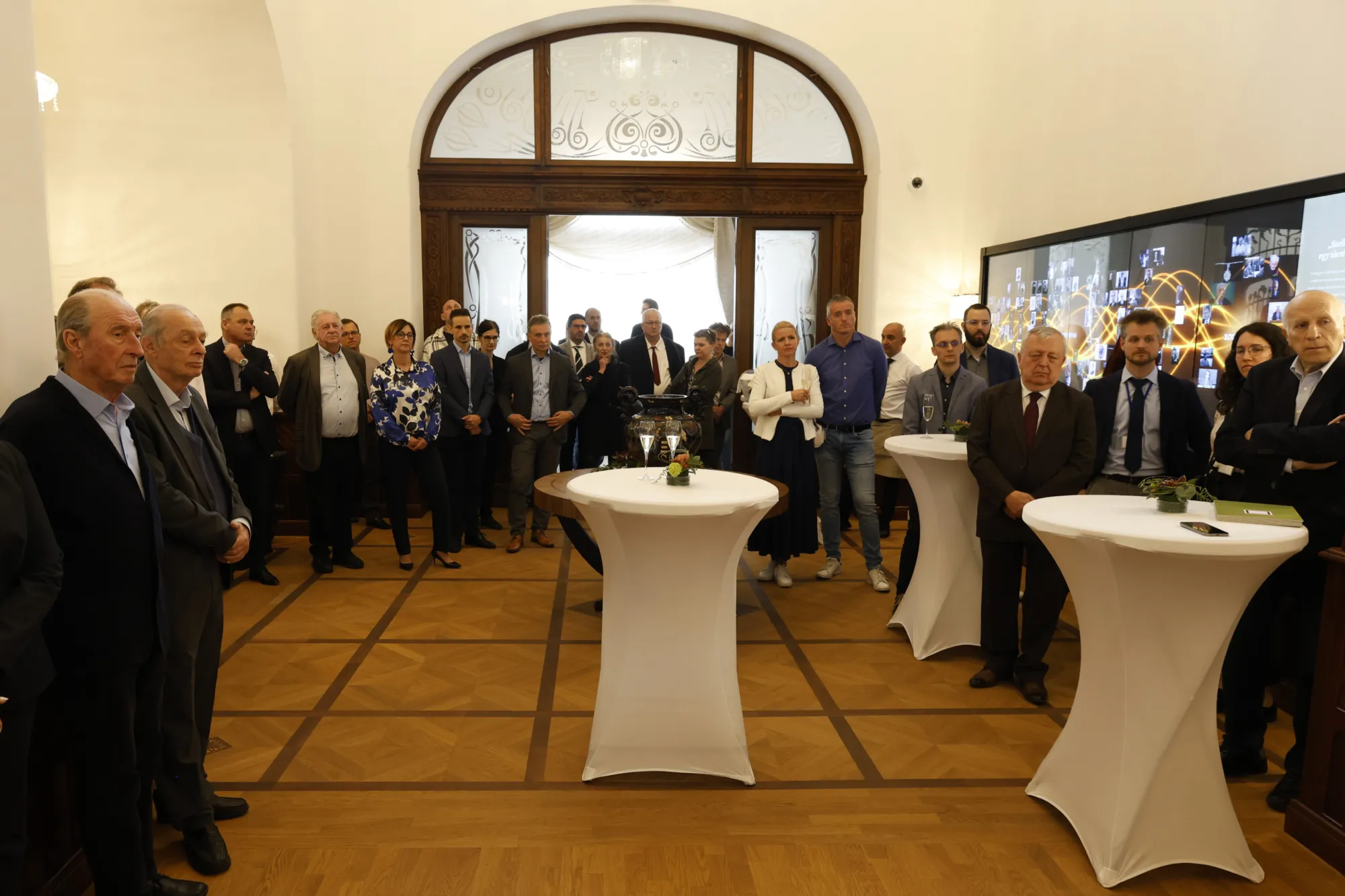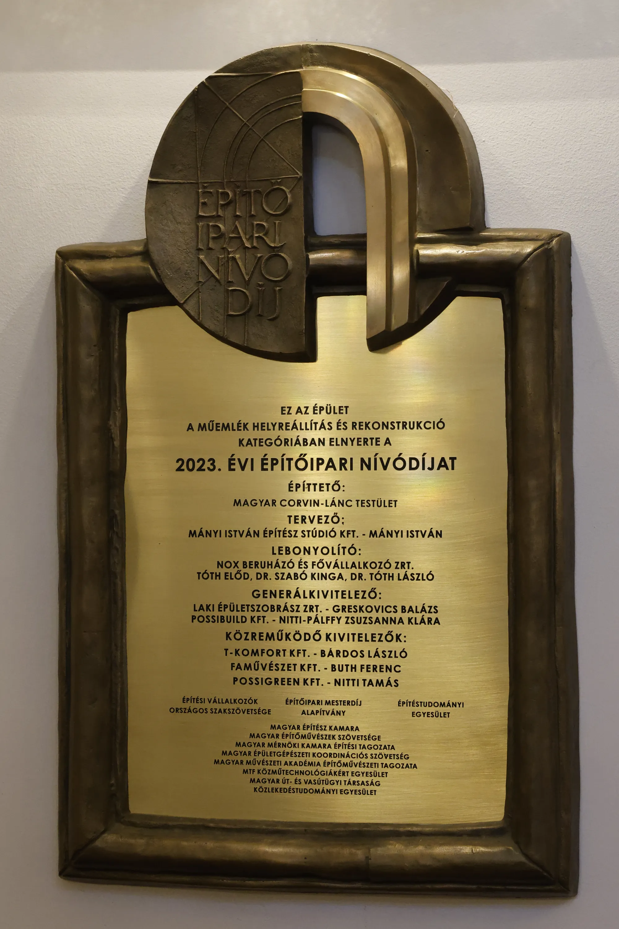 A díjról szóló emléktábla felavatására 2024. április 18-án, ünnepélyes keretek között került sor. A jelenlévőket Prof. Dr. Vizi E. Szilveszter, a Magyar Corvin-lánc Testület elnöke köszöntötte, beszédet mondott Dr. Klinghammer István a Magyar Corvin-lánc Iroda vezetője, Tolnay Tibor az Építőipari Mesterdíj Alapítvány Bíráló Bizottság elnöke, Béres Lajos a LAKI Épületszobrász Zrt. vezérigazgató-helyettese, valamint Bálint Péter az Építőipari Mesterdíj Alapítvány Bíráló Bizottság elnökhelyettese, aki átadta a kitüntető okleveleket.